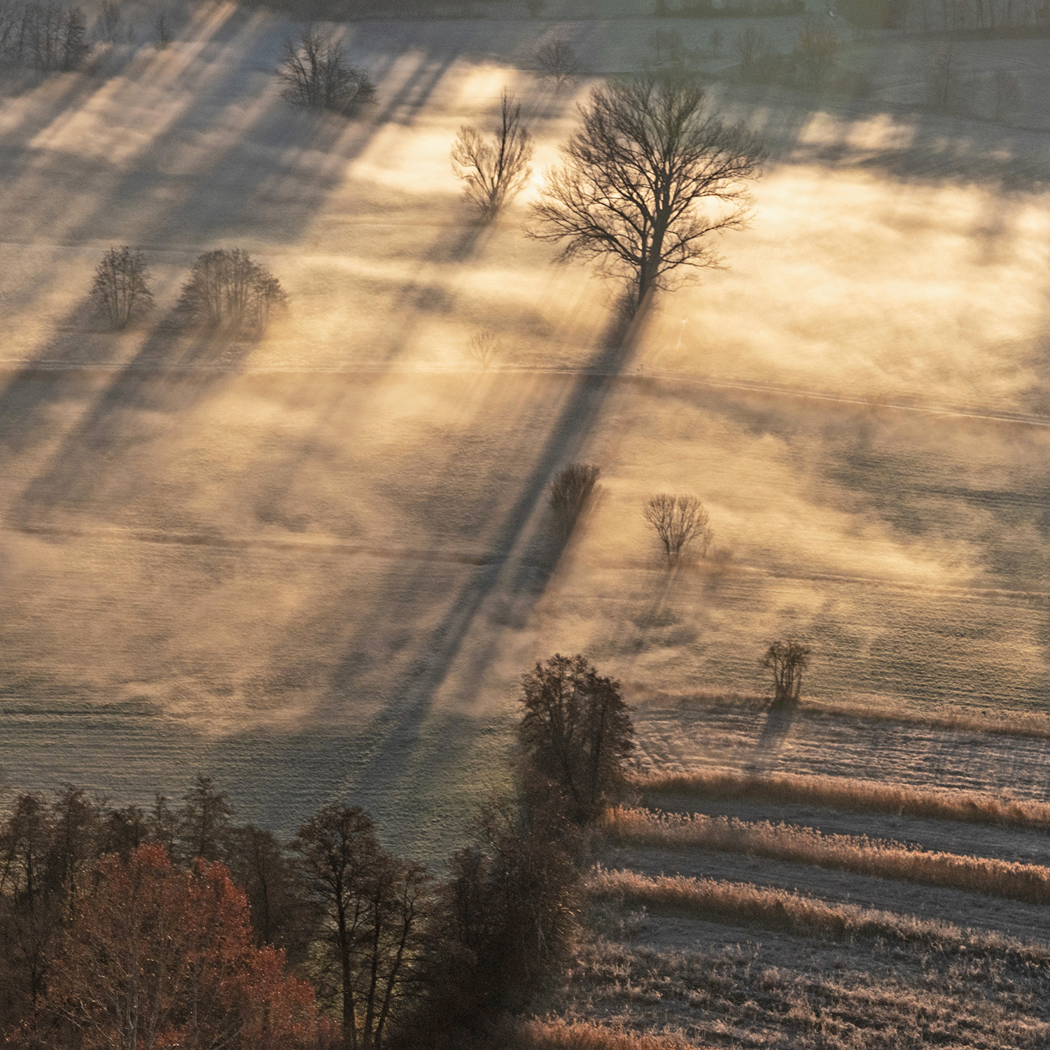 Un filo di nebbia maschera appena il campo, lasciando liberi gli alberi. Bella la luce radente e le tonalità naturali.