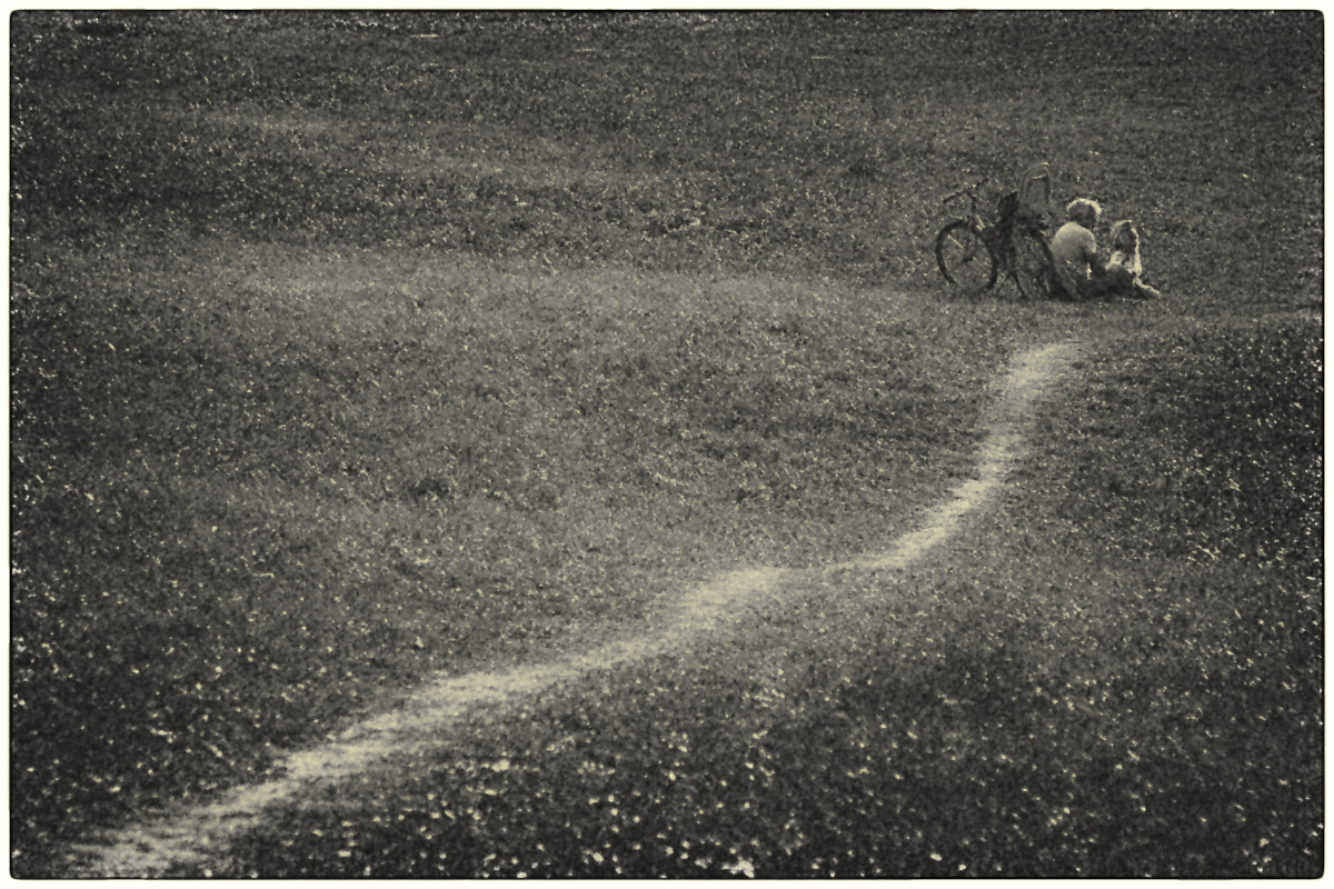E così ecco che questa immagine fatta di un piccolo sentiero nato spontaneamente giorno per giorno dal calpestio spontaneo della gente che ha tracciato un percorso sul prato porta ad una madre e al bambino con la bicicletta per una scampagnata, porta a quel nocciolo umano che sostiene da sempre le nostre esistenze oggi spesso spossate dal frastuono della tecnologia, dall'IPER di tutto un po'. La semplicità di un parto montano con le margheritine ormai sbiadite dalla corrosione dell'immagine latente di una stampa rinvenuta in un cassetto umido dopo 50 anni sembra , almeno per me, ricondurmi in maniera intatta verso un attimo di quel tempo che ho amato con gli occhi e il cuore di un ragazzo, con i suoi dubbi e le sue speranza, le sue illusioni e le sue aspettative ma certo di respirare e guardare un cielo più sano e limpido di quello odierno.