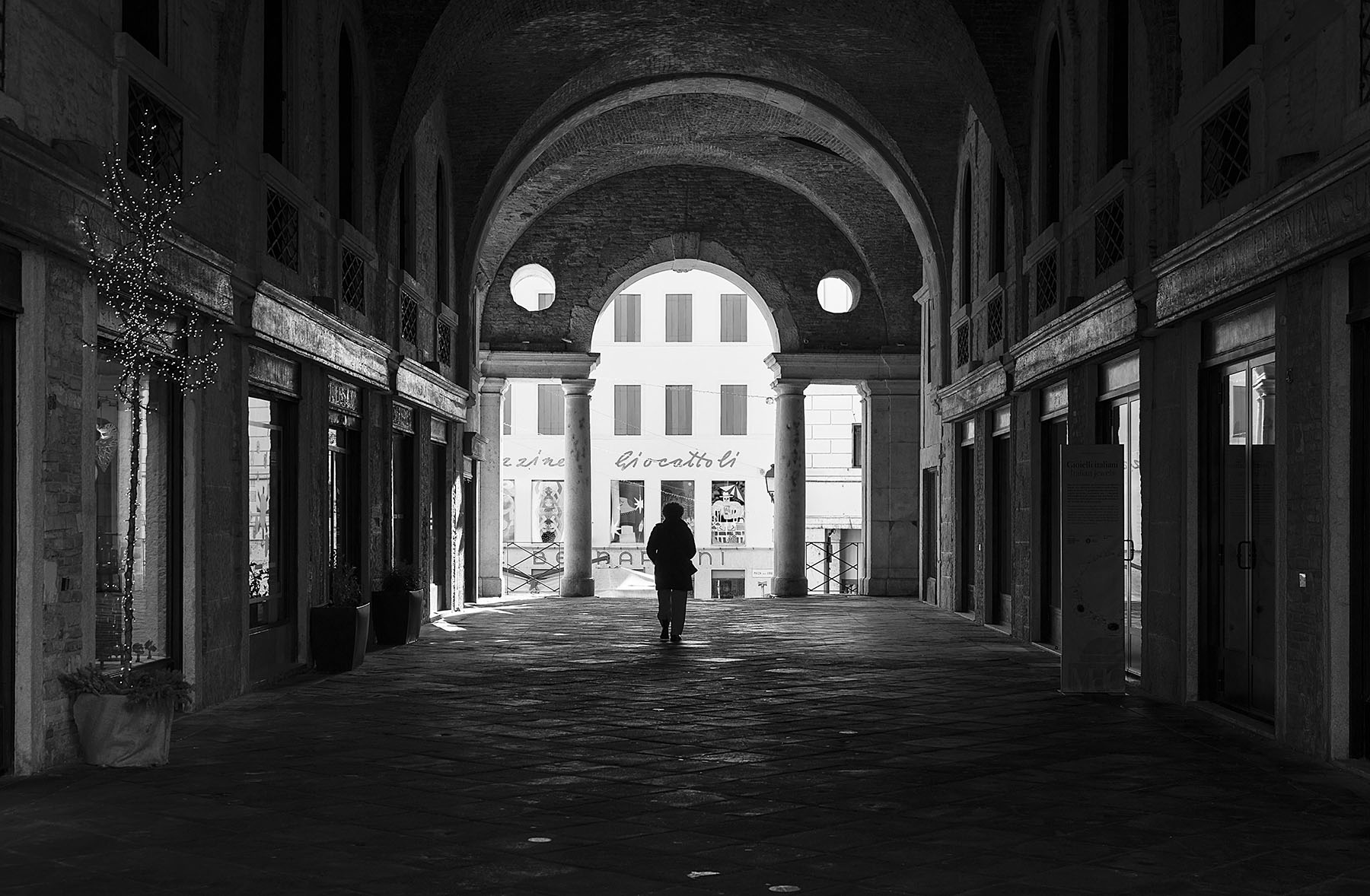 La precisione consueta per questa visuale tipica vicentina di 'sotto la basilica'. La persona che transita ravviva il tutto, con un biancoenero curato e adeguato alla ambientazione. Ciao, Francesco _________________ Fotocamere Olympus OMD e PEN, Panasonic G3. Software GIMP