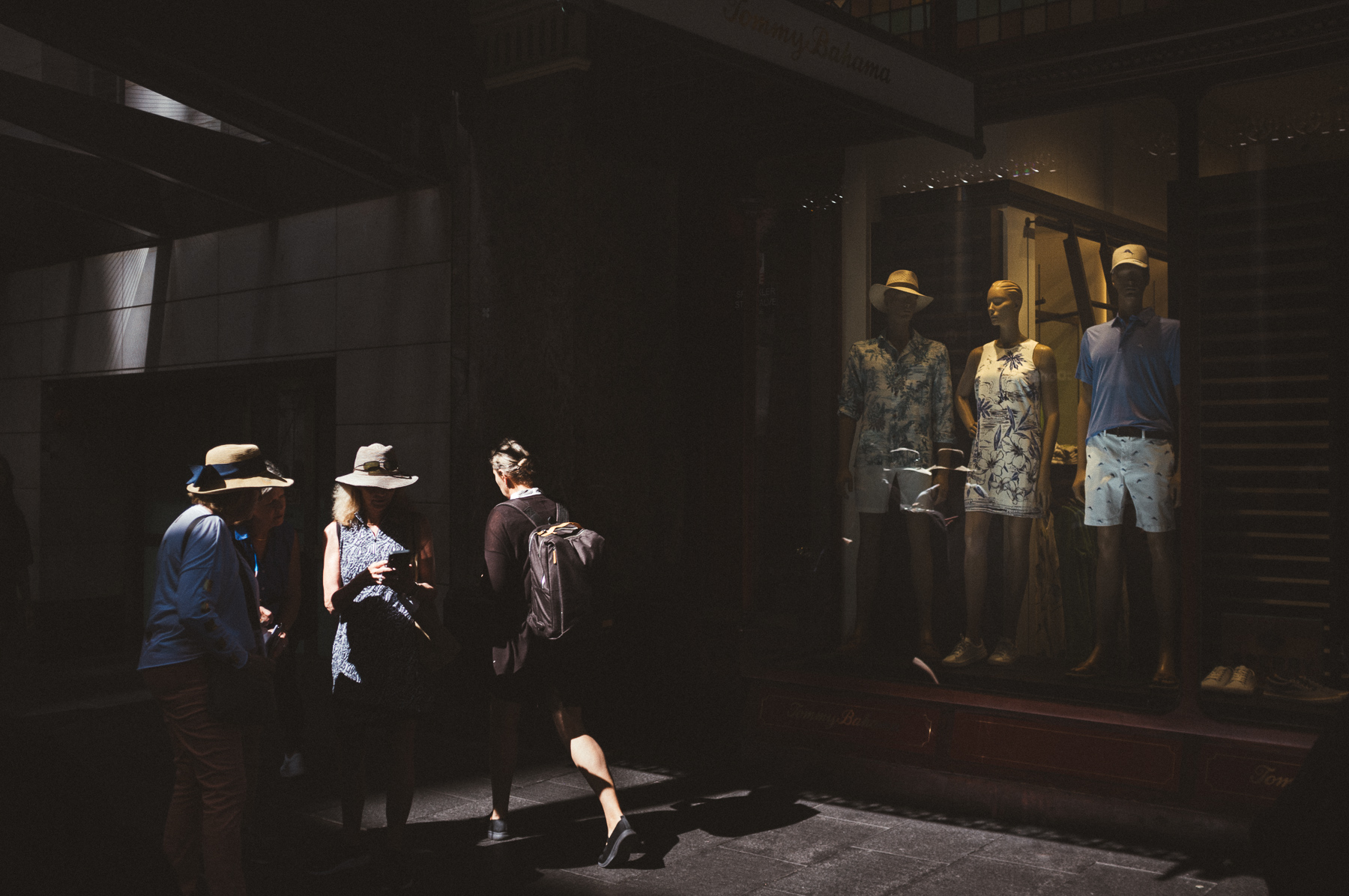 Quattro nella realtà, ma la signora è quasi coperta dalla figura in primo piano e quindi il richiamo del trio ci sta… e ci sono anche i doppi cappelli! Ok! Molto ben vista, la luce aiuta a isolare i protagonisti… Mi piace!