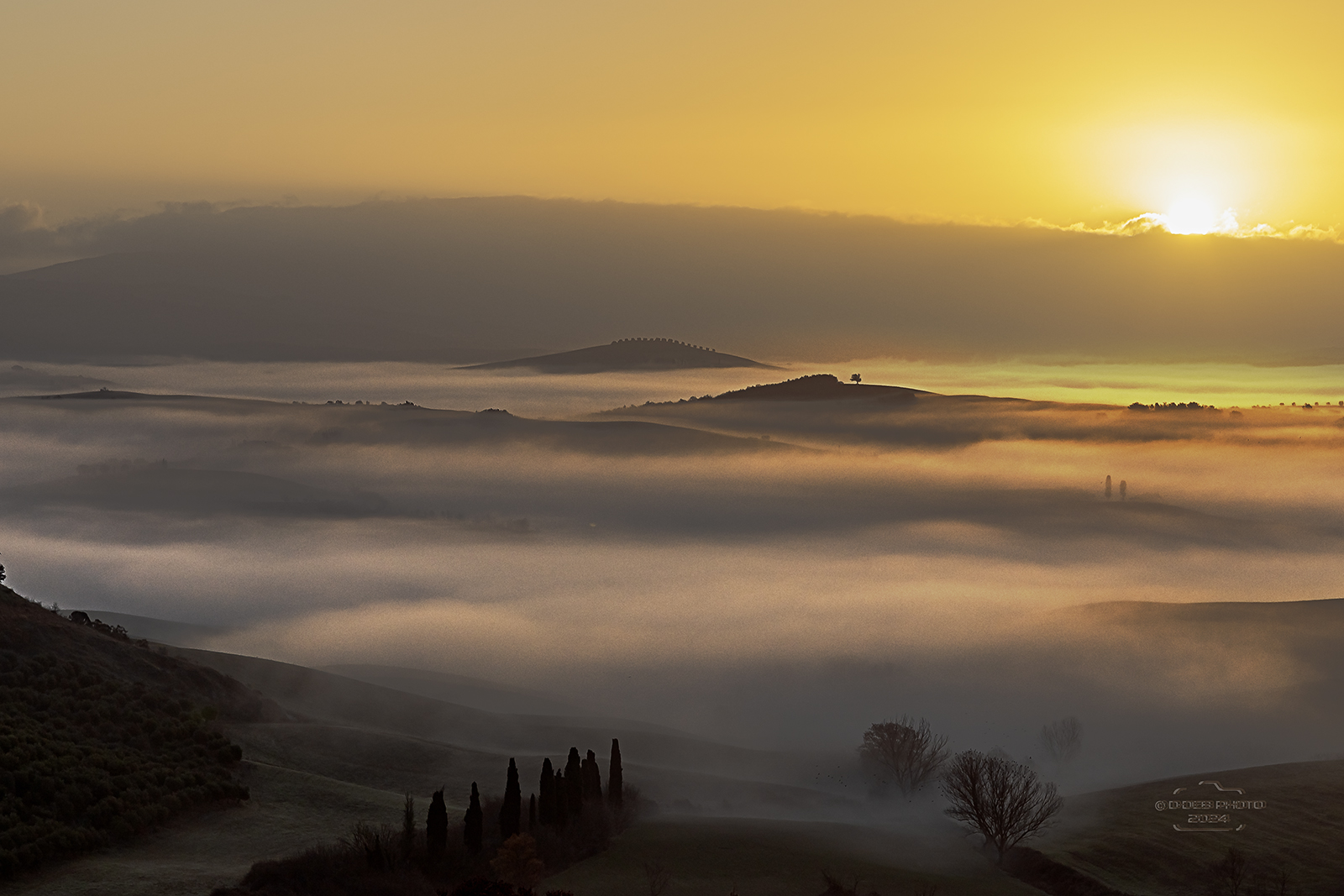 Atmosfera sognante, toni caldi ed avvolgenti e luce radente che dà forma e volume alla bassa foschia