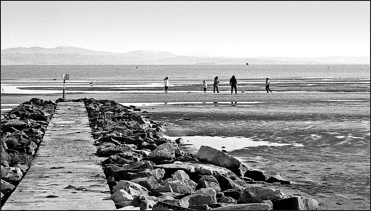 L'occhio indaga la passerella tra i massi che ti trasporta al centro dell'immagine dove è bello mirare ciò che lascia la bassa marea, la distesa del mare e i profili attenuati delle montagne.