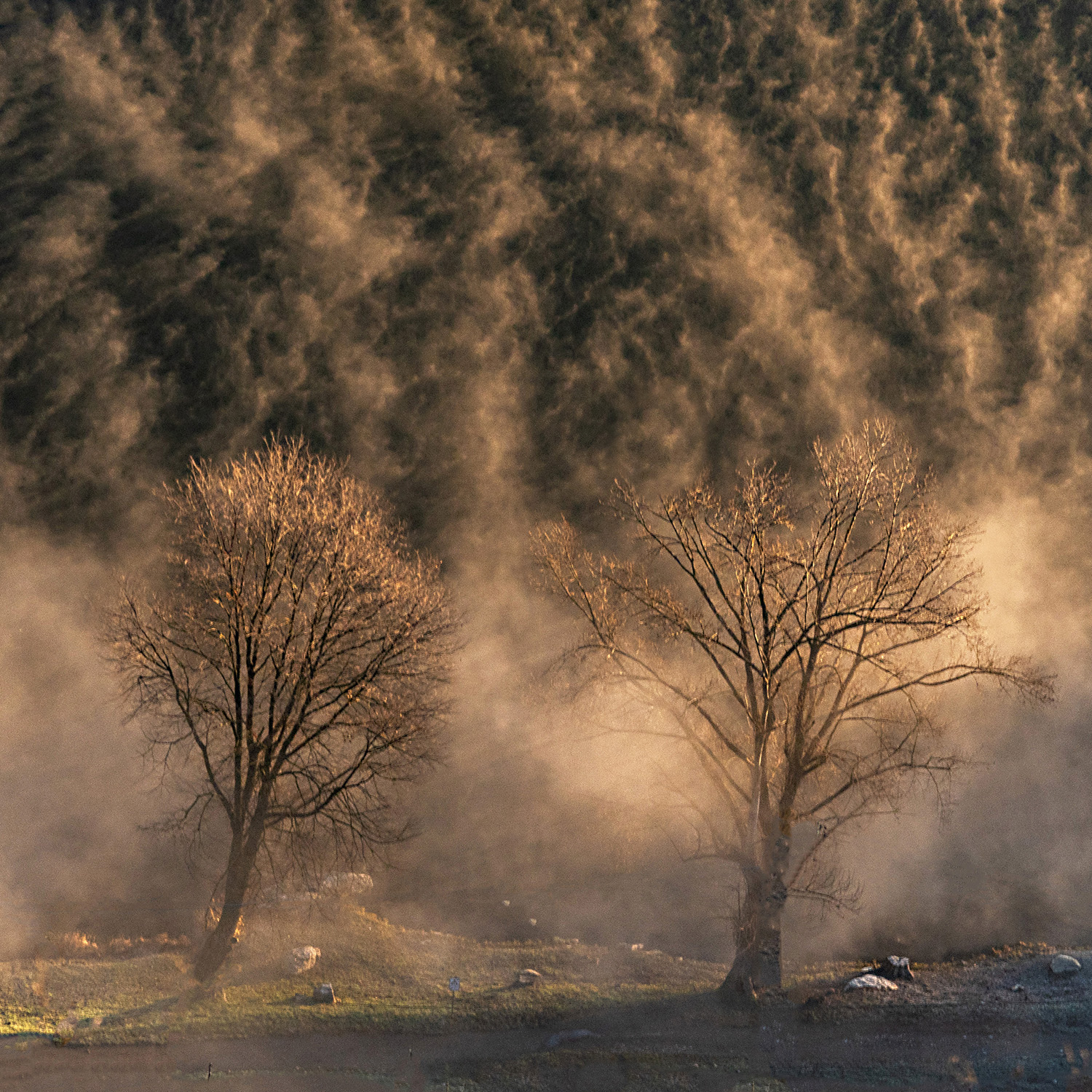una cascata di nebbia dietro i due alberi, bella atmosfera