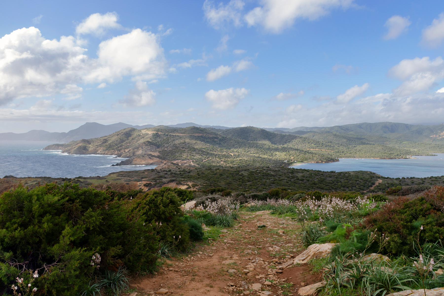 Il sentiero che ci porta avanti e avanti, la terra che prima si stringe e poi si allarga con le sue ombre di nuvole, il mare che fa da cornice...