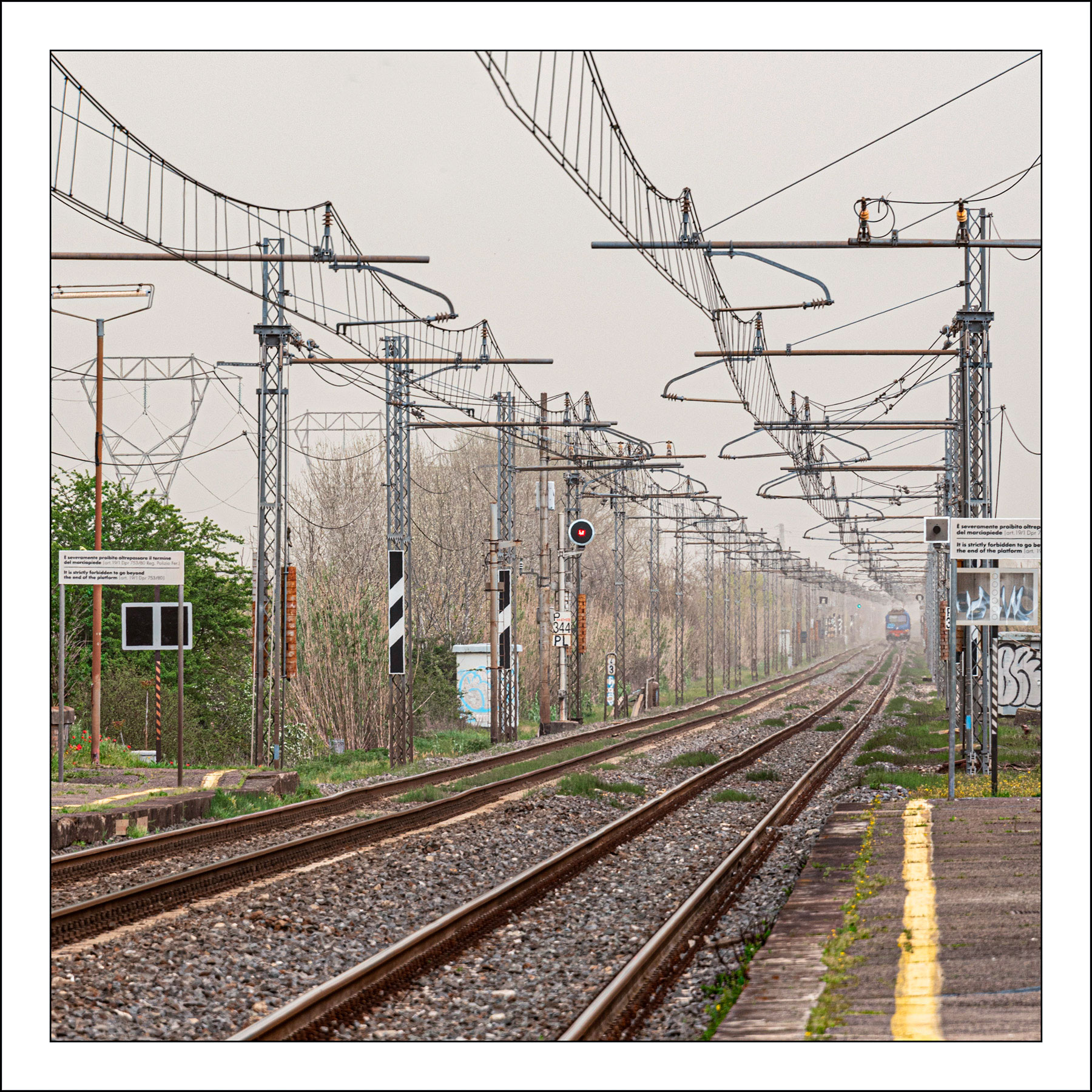 Ottimo il punto dove binari, rete elettrica, tralicci convergono nel punto dove è in transito il treno per poi perdersi nella foschia.