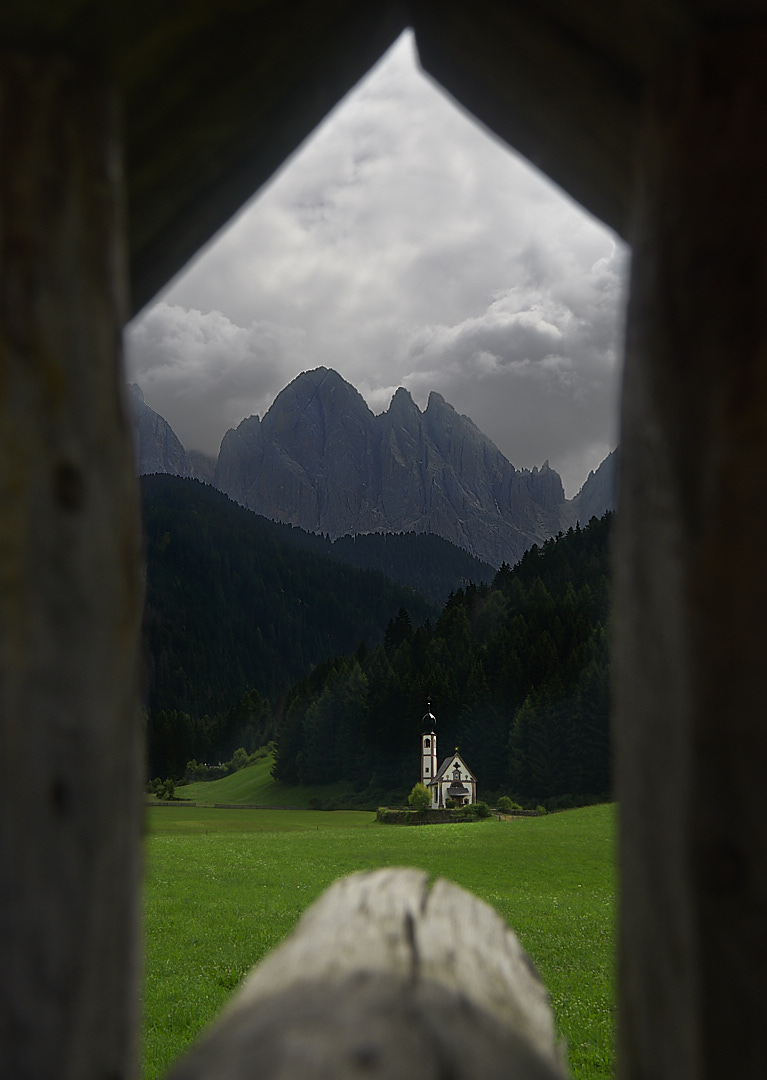 Bel PDR della chiesetta ai piedi delle Odle. Hai scattato attraverso la recinzione che ne limita la veduta se non vado errato. forse un pochino troppo di contrasto (vedi righino bianco sui contorni), avrei inoltre aperto leggermente le ombre anche per dare enfasi al cielo minaccionso.