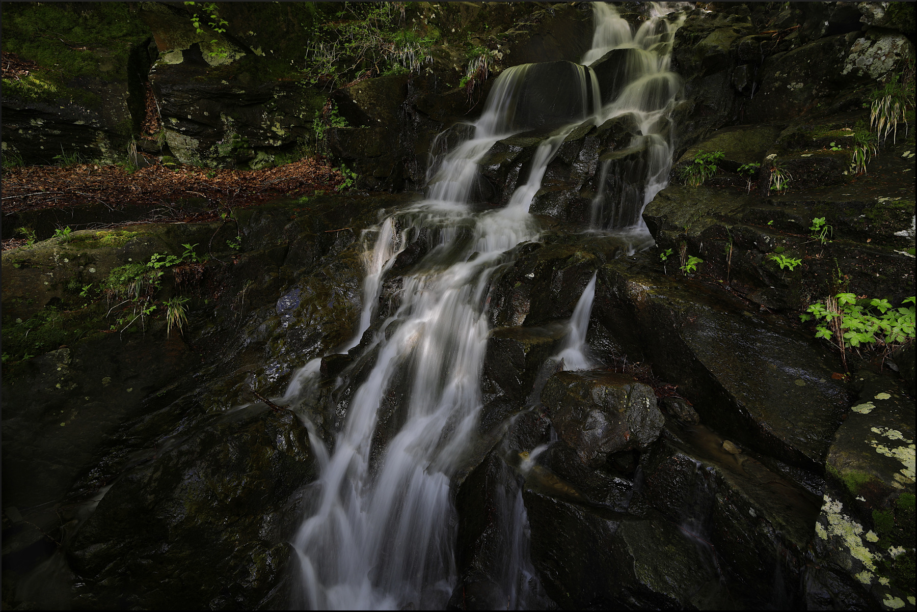 Si in effetti l'idea di sottoesporre i massi mette in risalto lo scorrere setoso della cascata e il verde brillante delle foglie verdi.