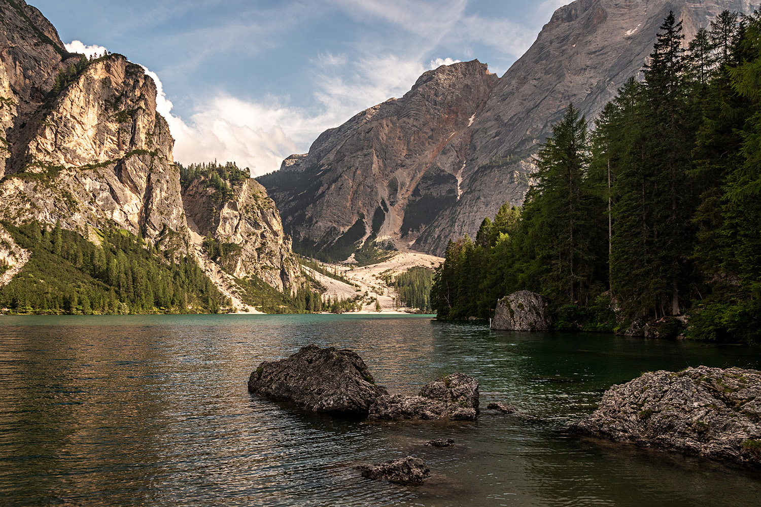 Ottima ripresa, di quello che se non sbaglio è il lago di Braies, buonissima la resa materica delle rocce.