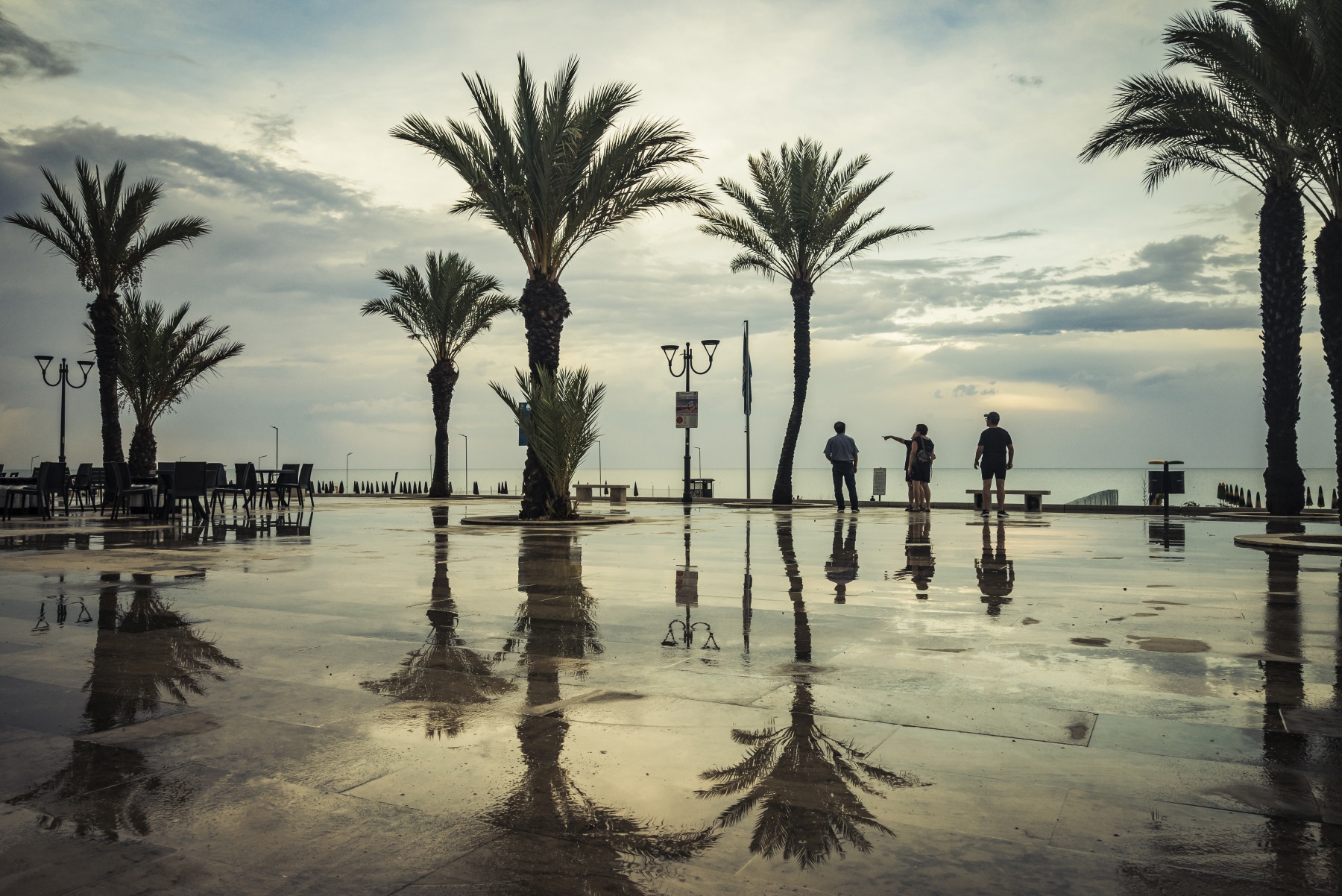Composizione equilibrata e simmetrica con i riflessi umani e delle palme che aggiungono profondità alla scena.