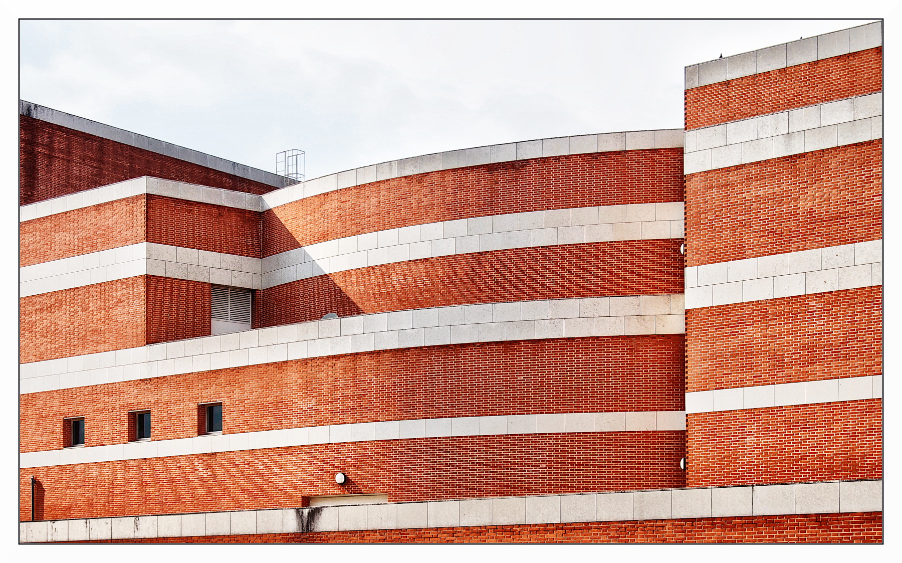 Contribuiscono a ciò le rientranze le della struttura e le strisce bianche che interrompono il rosso mattone. Anche l'ombra su una piccola parte della struttura contribuisce a rendere la facciata movimenta. Il cielo non è il massimo ma ha il pregio di richiamare le strisce bianche.