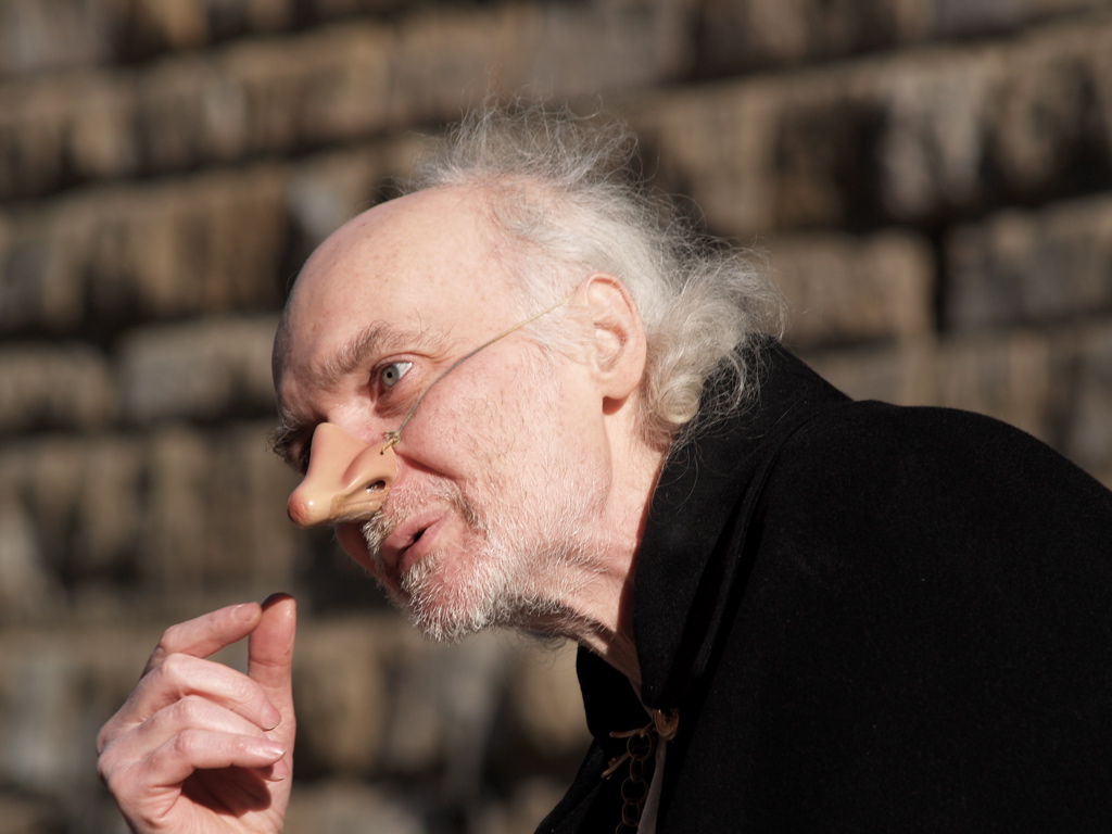 tirare via il segno del cordino che tiene il naso finto, sitemare un pokino la parte in alto a sx del naso in modo da farlo sembrare vero, farla con un b/n decisamente contrastato ed aggiungerci la grana..... che ne pensi ??