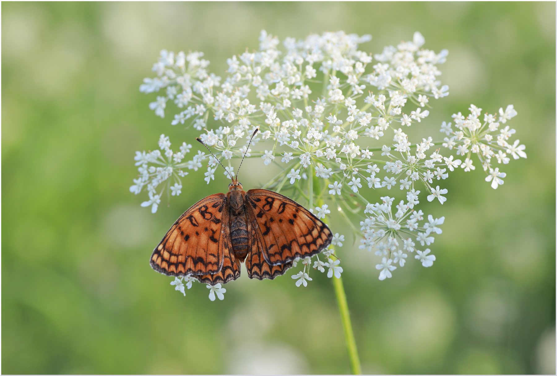 Ottimo il contrasto tra i colori caldi della farfalla, la delicatezza del fiore e lo sfondo verde.