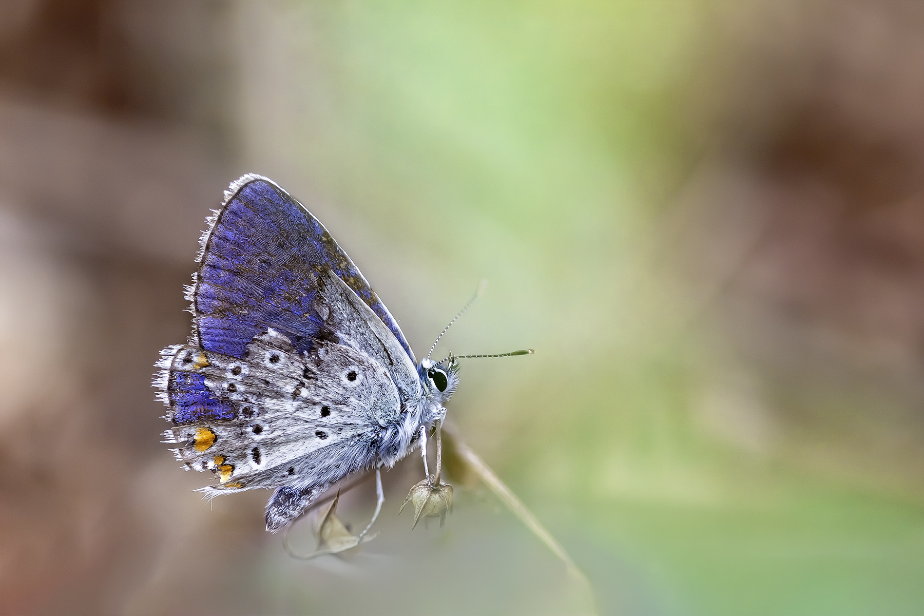 La piccola Polyommatus icarus alla fine dei suoi giorni, scatti a mano libera, a T.A.