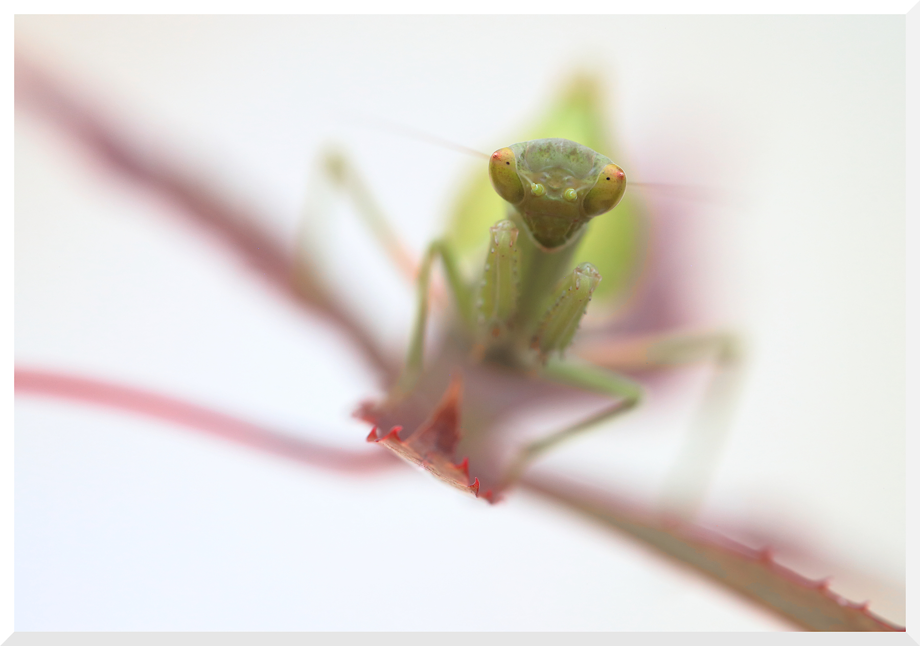 Inoltre lo scatto mi piace per la visione insolita di questo insetto, per i colori della mantide che si armonizzano con lo sfondo e per l'atmosfera onirica che emana dalla composizione.