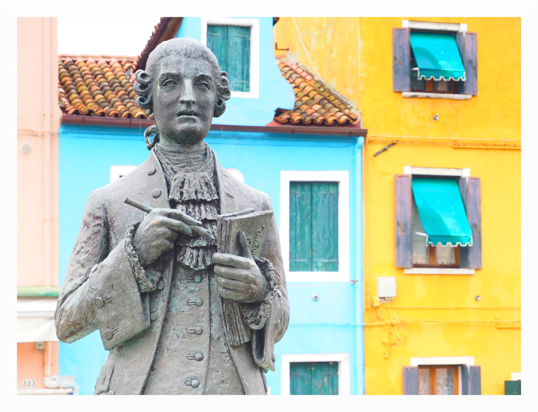 Molto bello il contrasto tra l'austerità della statua e lo sfondo colorato delle caratteristiche case di Burano.