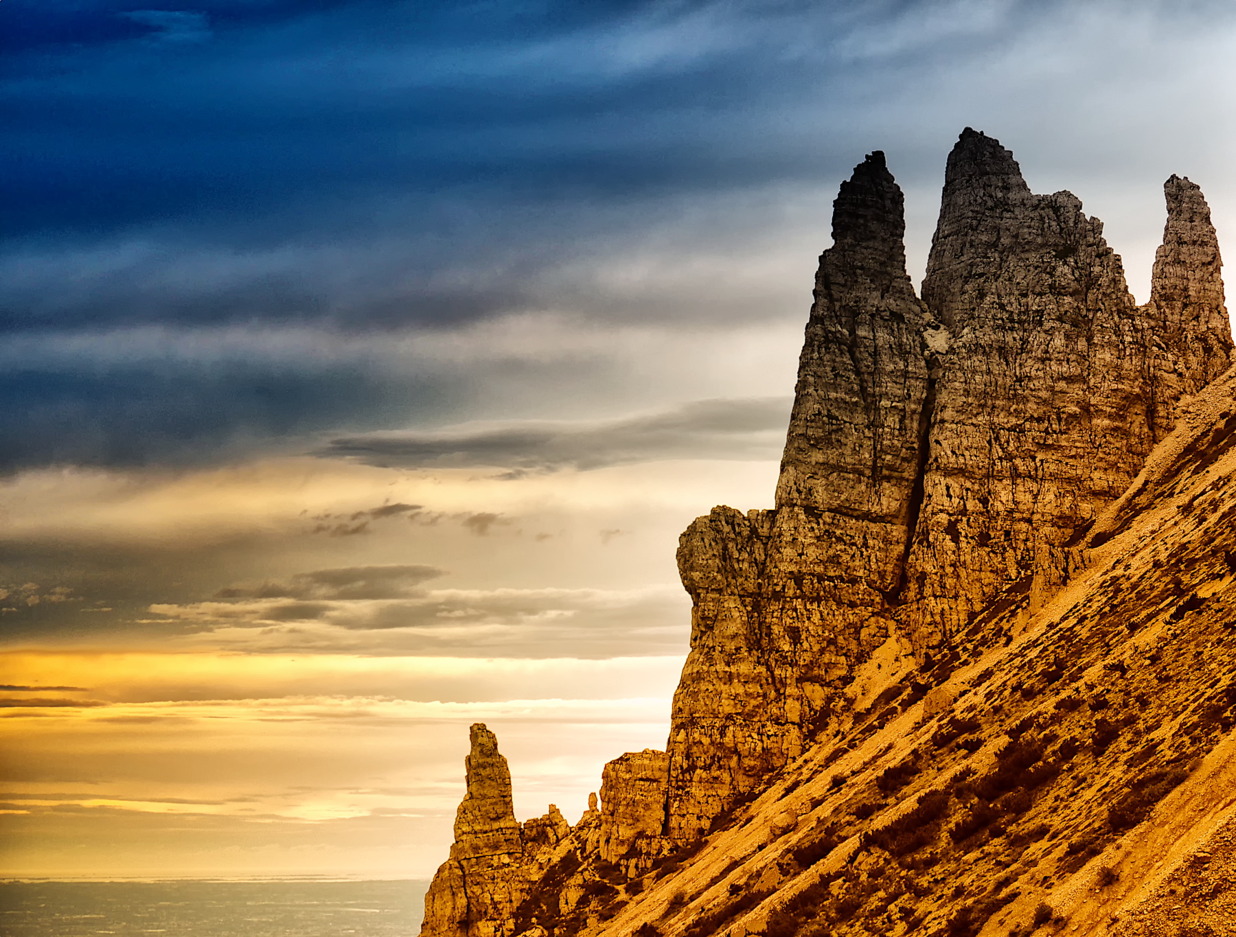 Il cielo è una tavolozza di colori che si contrappone alla monocromia delle rocce. La loro dentellatura (delle rocce) ben si staglia sul pittoresco cielo.