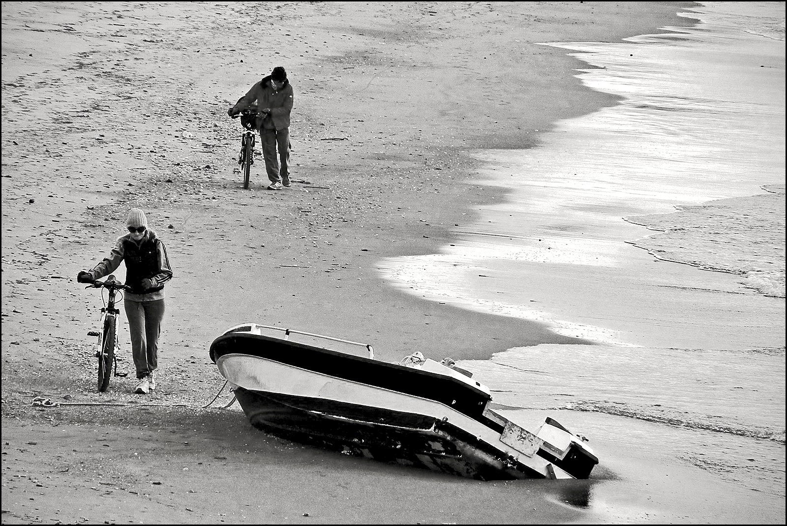 Bella composizione. I ciclisti non sembrano minimamente interessati nè sorpresi dalla presenza dell'imbarcazione insabbiata.
