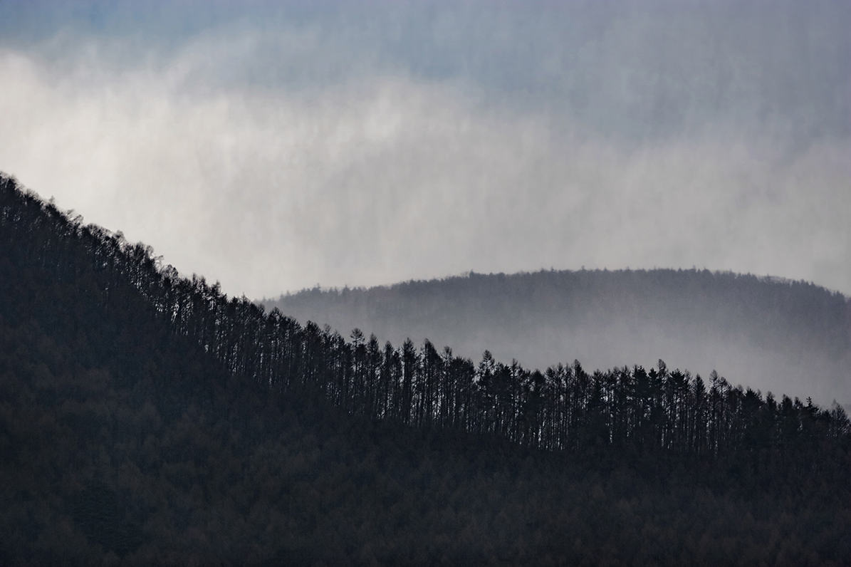 Da apprezzare il ritmo degli alberi in primo piano che si stagliano contro il cielo nuvoloso e la collina sullo sfondo.