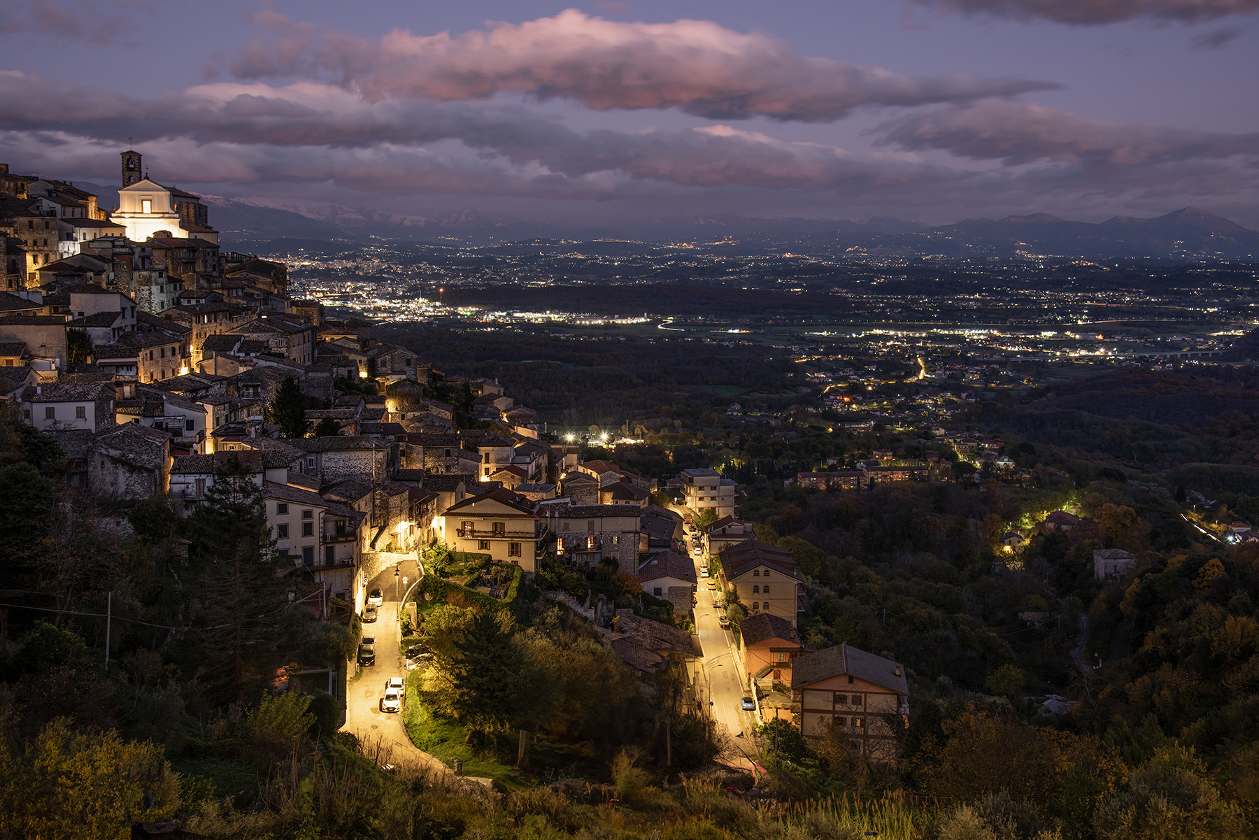 Un bel paesaggio ripreso in quei pochi minuti affascinanti in cui i colori di un tardo tramonto si mescolano alle umane illuminazioni artificiali. Il paesello addossato alla collina sul lato sinistro e il pianoro illuminato sottostante sono inoltre armoniosamente distribuiti dell'inquadratura. Belli i colori e apprezzabile la nitidezza. Ciao, Francesco _________________ Fotocamere Olympus OMD e PEN, Panasonic G3. Software GIMP