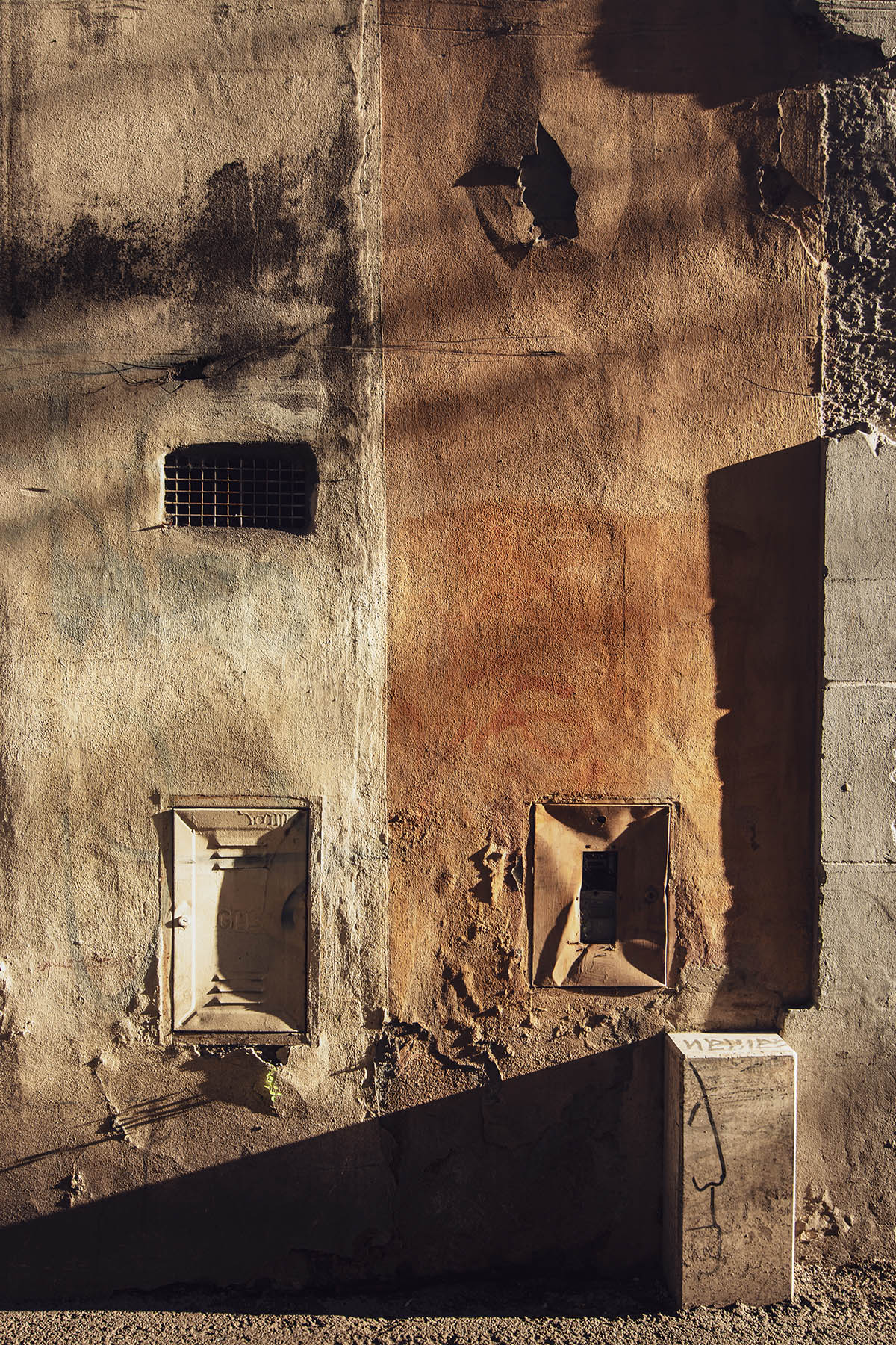 | l'aggressione del tempo e l'incuria hanno lasciato segni indelebili che la luce e le ombre drammaticamente accentuano. |