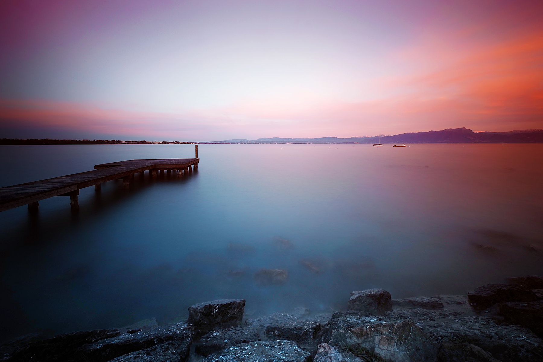 La composizione è ottima con il molo che fa da linea guida verso le montagne sullo sfondo; mentre le rocce in primo piano danno un senso di profondità.