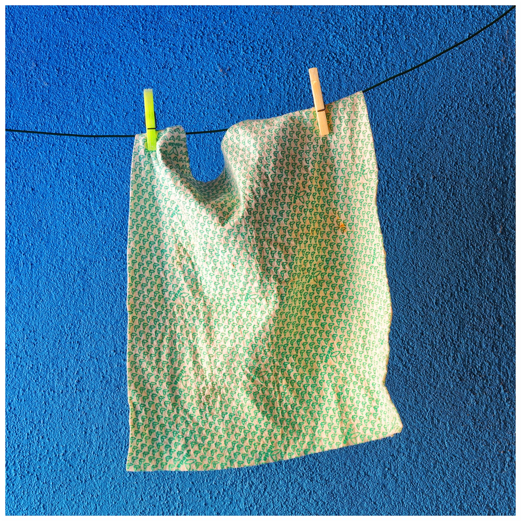 Giallo su blu è palesemente un abbinamento che attira l'attenzione e la somma dei due ci da il verde del tema "vileda" del panno, direi che cromaticamente non si poteva chiedere di più.