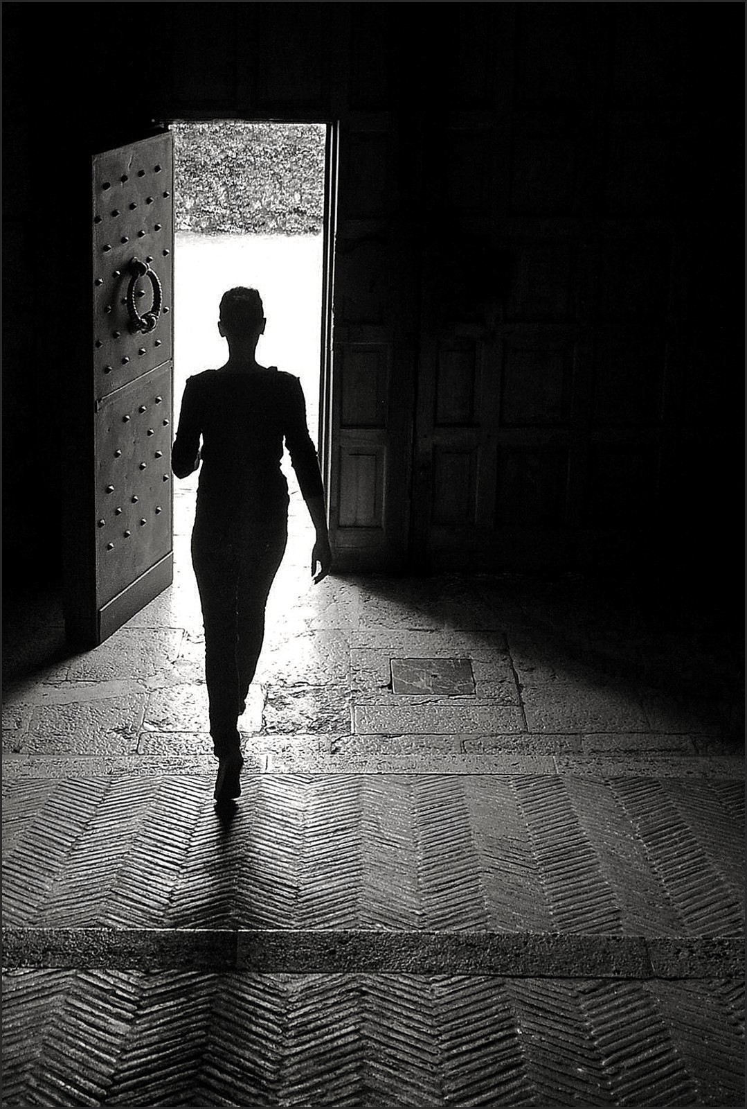 Sembra la copertina di un noir, con la figura perfettamente inquadrata nell'uscire da un luogo antico, testimoniato dal bel pavimento a spina di pesce e dal pesante portone.