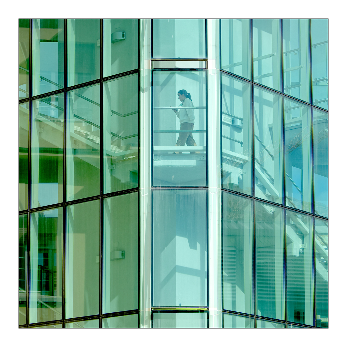 | La composizione non è impeccabile ma il colore verde/turchese/celeste che contraddistingue la parete a vetri è molto attraente, ben colta la donna perfettamente al centro.
