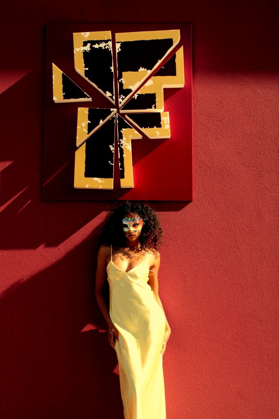 Molto belli i colori cosi caldi ed accesi, indovinato l'accostamento della modella al quadro/scultura che la sovrasta.