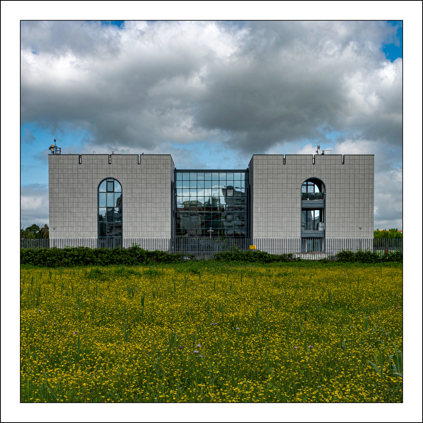 Fa uno strano effetto l’edificio rigido e squadrato mollemente adagiato sul prato fioritissimo.