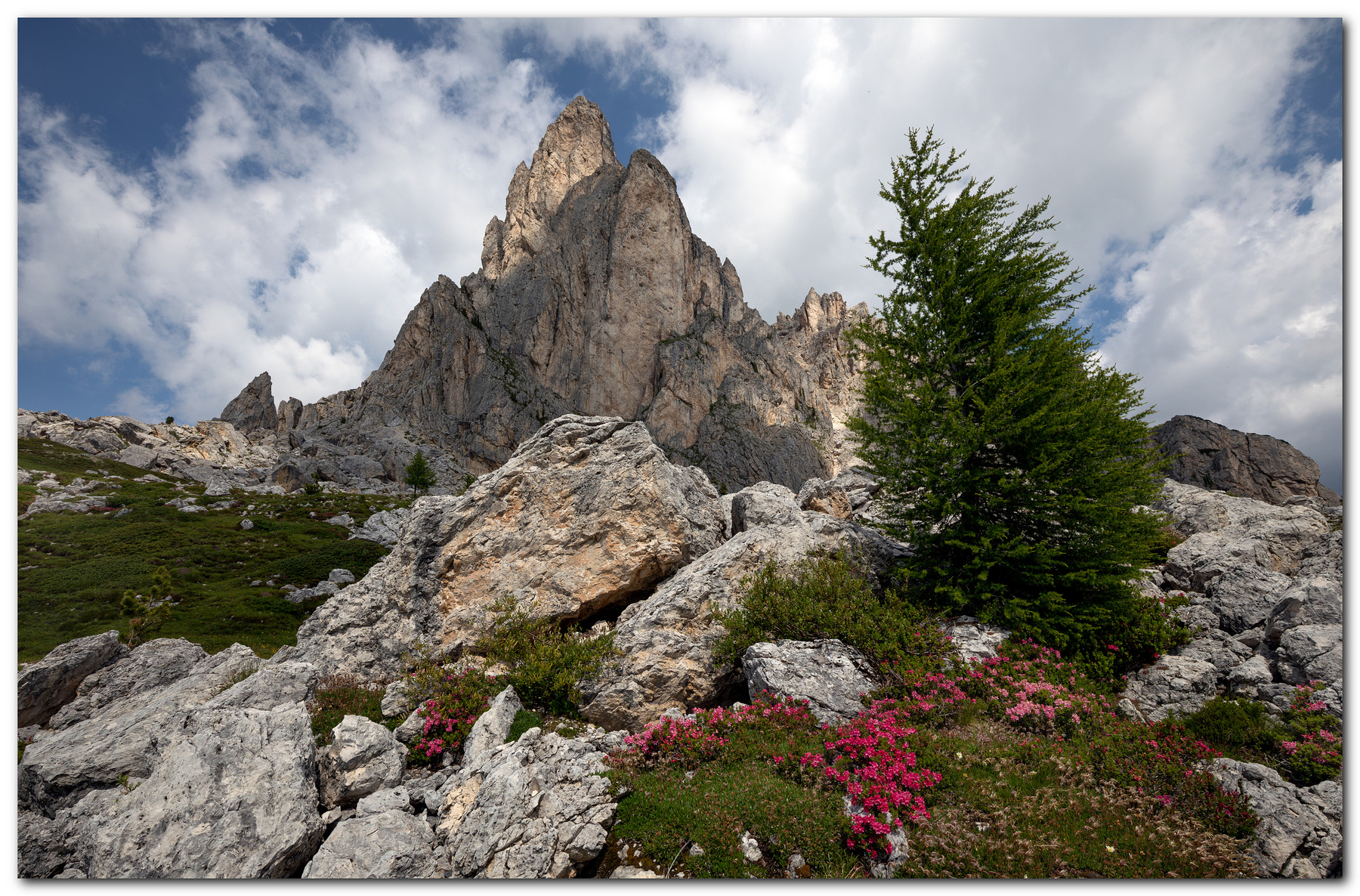 Bellissima visione di questo ambiente dolomitico, di questo soggetto rupestre molto noto, ripreso da posizione abbastanza ravvicinata e da angolazione appena un po' più defilata rispetto alla gran parte delle sue foto. Qui è molto apprezzabile la luce diffusa, che non crea ombre e contrasti eccessivi: solo la parte superiore delle rocce sembra accesa dalla luce solare diretta. Il cielo è appunto vivacemente variegato di nubi estive, il primo piano è fortemente evocativo dell'alta quota con i fiori, il pascolo, i mughi, qualche isolata conifera, le rocce affioranti, le svettanti dolomie della 'Gusela' sono deliziose. La guardo questa foto, e mi sembra di essere lì: ed è un gran complimento. Ciao, Francesco _________________ Fotocamere Olympus OMD e PEN, Panasonic G3. Software GIMP