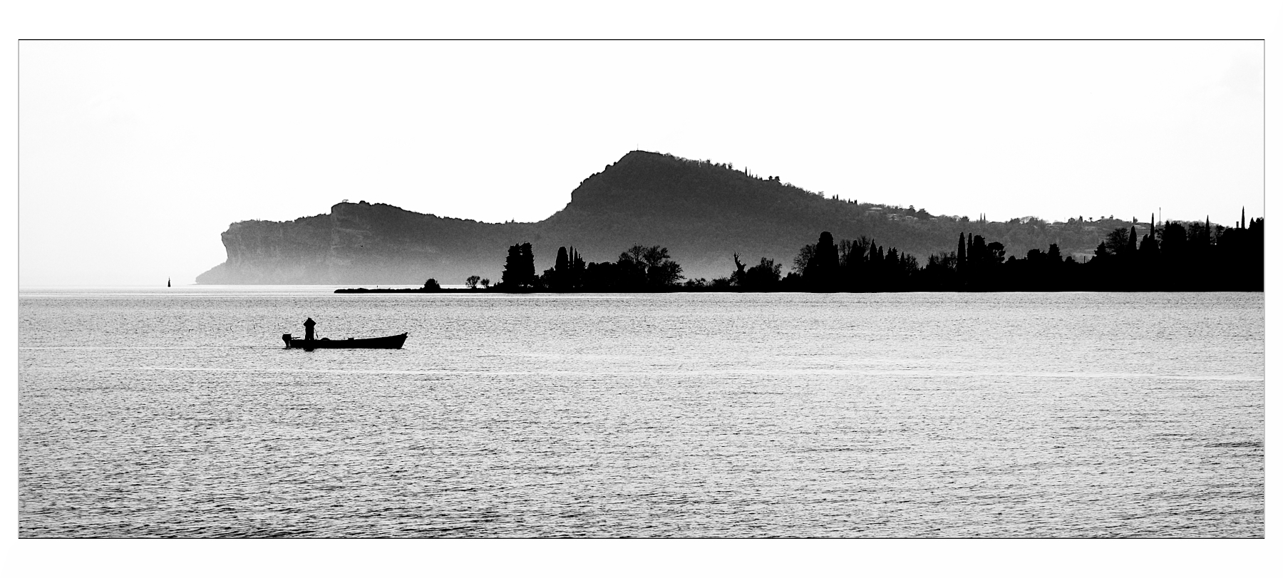 Durante la navigazione da Garda (VR) a Salò (BS): vista verso l'Isola di Garda e il promontorio di Manerba. Marzo 2025