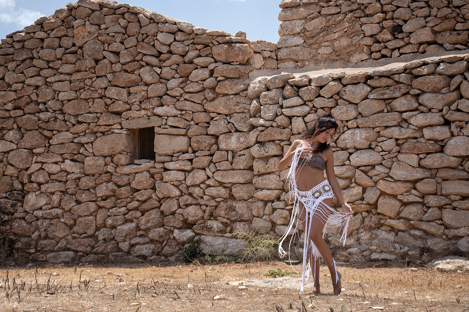 Bravissimo! Bellissimo il contrasto tra l'eleganza quasi orientale della modella e l'ambiente rurale! Una miscela di morbido e ruvido!