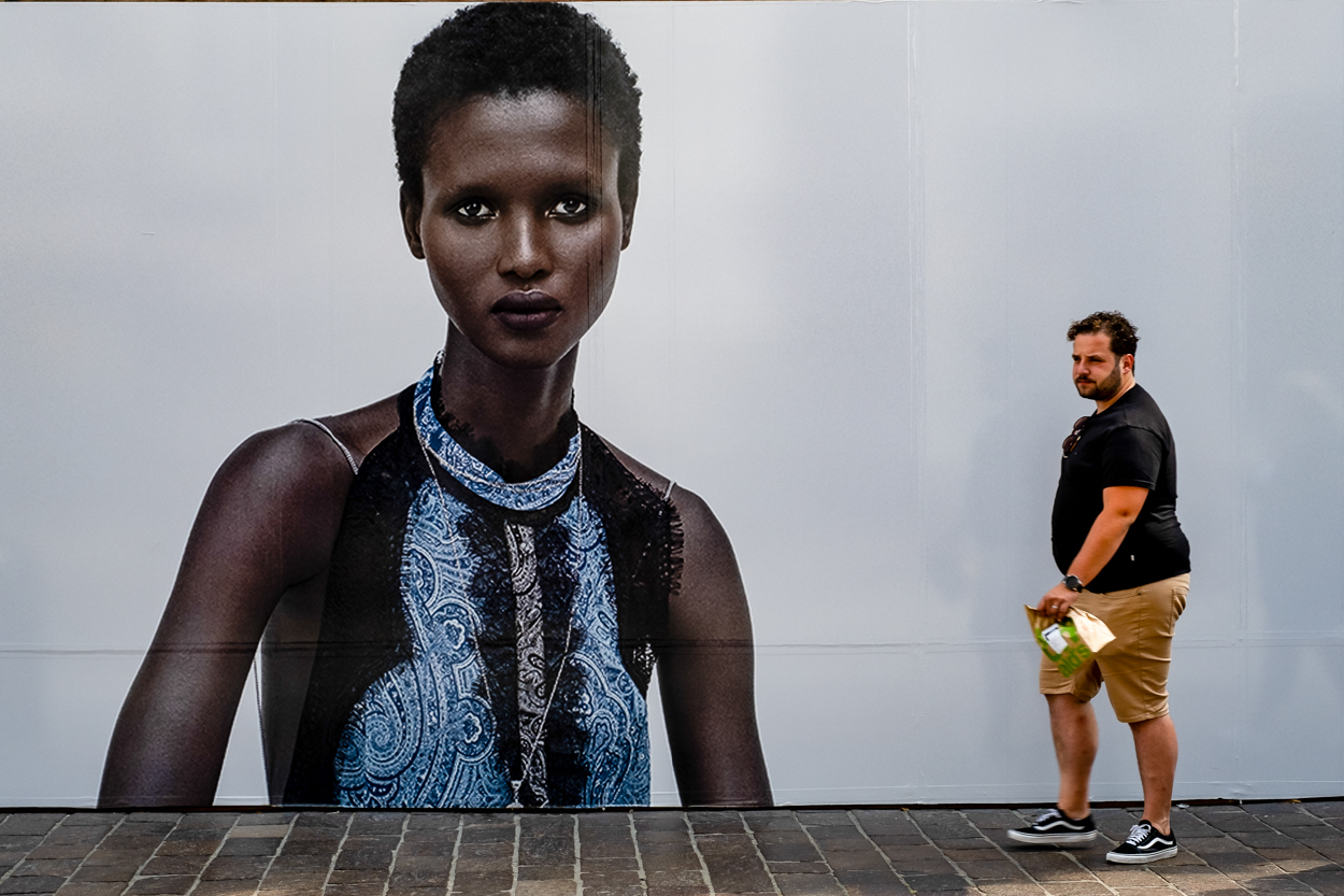ma questa foto racconta qualcosa... abbiamo la contrapposizione della modella di colore ovviamente bella ed in forma con la persona presente nella scena; tra l'altro l'espressione di questa ragazza è pure interessante e singolare, quasi stupita e disorientata del corpulento ragazzo che le sta per passare davanti, e la contrapposizione sta in questo... due stili di vita opposti ed inconciliabili che si mettono a confronto seppure in modi diversi...un poster ed una persona in carne ed ossa...