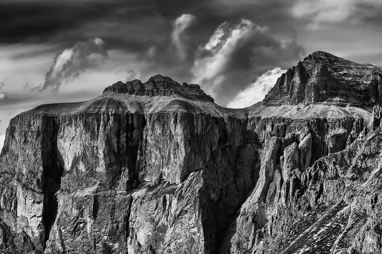 Sono sempre molto belle queste tue immagini dolomitiche in un bianconero pregevole. Queste cattedrali di roccia del gruppo del Sella sono molto caratteristiche per quelle ghiaie in alto che creano come un gradone prima della loro parte più elevata, dove si nota palesemente la stratificazione sedimentaria. Ottimo il dettaglio e sempre piacevolissimi i tuoi cieli nuvolosi. Sono certo che anche a colori questa sia una buonissima immagine, queste rocce hanno una forte componente giallo-arancio. Ma in bianconero è, coerentemente, la 'tua' fotografia. Ciao, Francesco _________________ Fotocamere Olympus OMD e PEN, Panasonic G3. Software GIMP