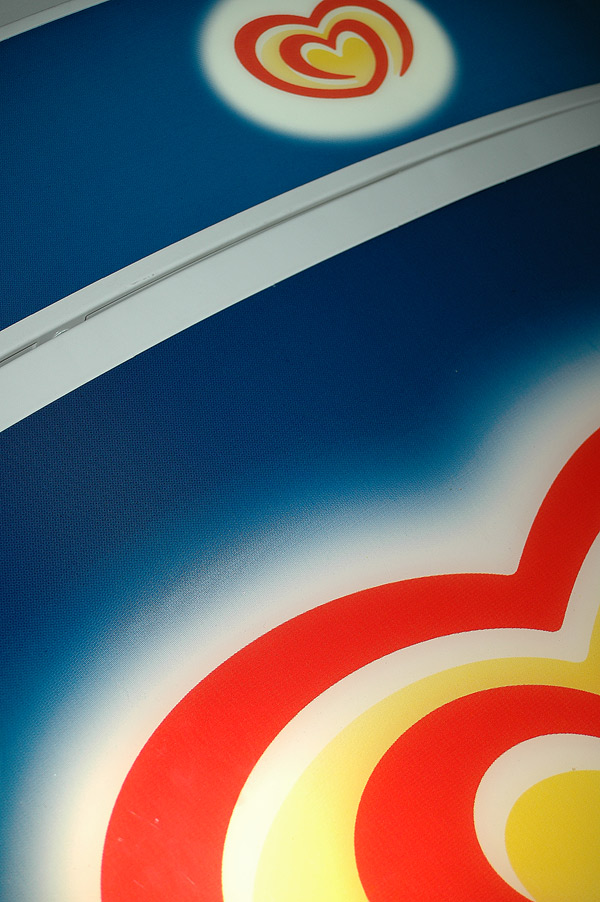 Il logo dei gelati Algida per inaugurare questa serie da vicino su di un distributore automatico di gelati
