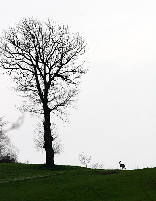 Un controluce da "ombre cinesi", mi piace perchè il capriolo è ben identificabile nella sua silhouette, sarebbe stato preferibile includere tutta la chioma dell'albero.