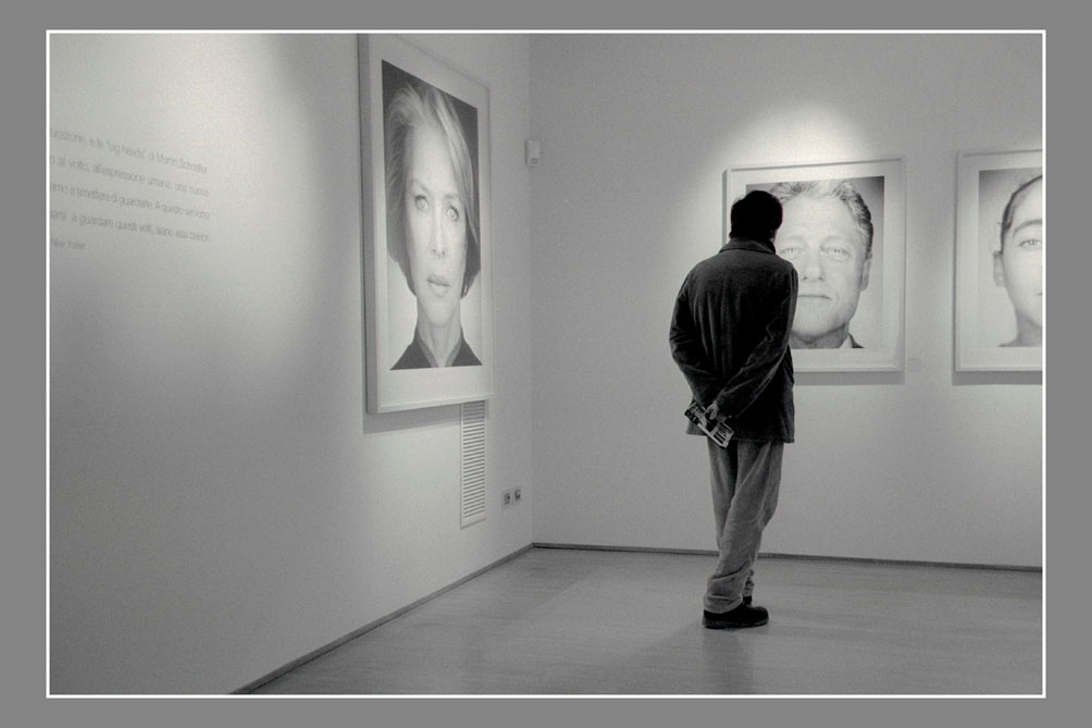 Bellissima, rarefatta, con le foto alle pareti che sembrano guardare l'osservatore disinvolto, con il catalogo in mano. Ottimo contrasto tra la figura scura e l'ambientazione chiara. Bellissimo il b&n analogico.