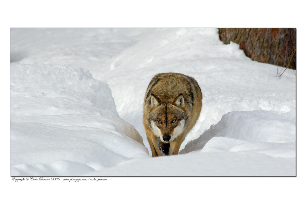 La foto mi piace molto ma sapete come l'avrei vista io? Così! Vi spiego perché: secondo me l'inquadratura orizzontale favorisce l'idea di 'staticità' mentre quella verticale esalta la componente di dinamicità dell'incedere del lupo. E indirettamente da maggiore forza allo sguardo minaccioso..