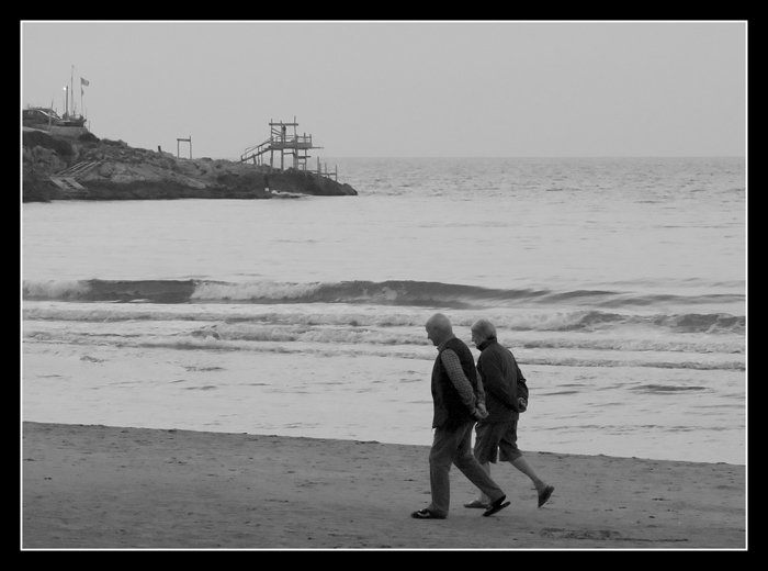 La cosa che colpisce è il passo e l'atteggiamento perfettamente simmetrico dei due signori, la cosa che piace di meno (a me) è lo sfondo, poco significativo (braccio di mare con brutte impalcature), non aggiunge niente alla situazione.