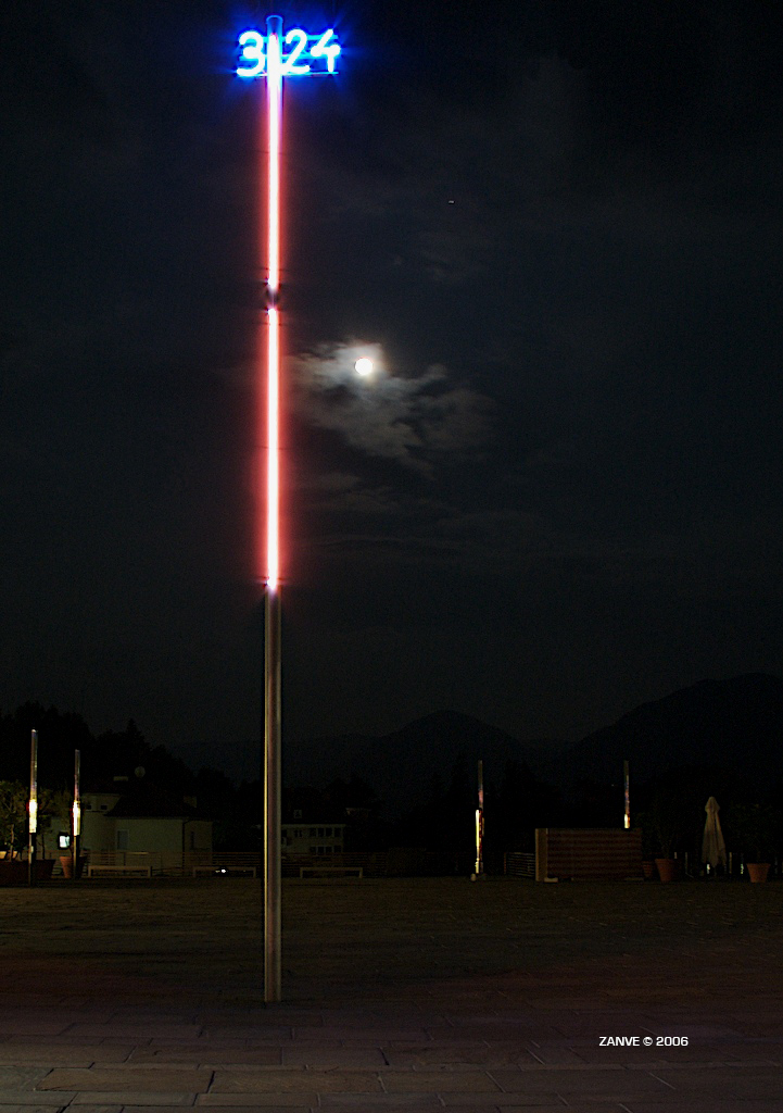 Stanissimo oggetto, un neon verticale con sopra un numero misterioso. Comunque mi piace la collocazione e la posizione rispetto alla luna, come mi piacciono i toni dello sfondo, un pò meno gli oggetti che si intravedono. Inizialmente pensavo ad uno stabilimento balneare, poi ho visto i monti. boh