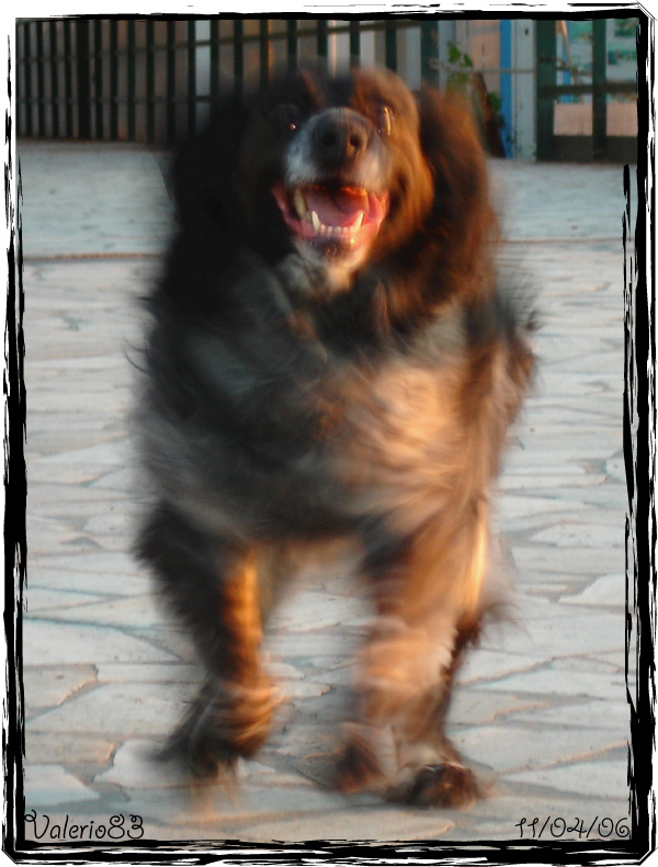 Scatto simpatico, mi piace l'effetto mosso che rende bene la pelliccia della cagnolina. L'ambientazione è ilpunto critico, disturba a mio avviso lo sfondo, e le mattonelle non sono il massimo da vedere. Secondo me è uno scatto da riprovare in un bel parco. Smile