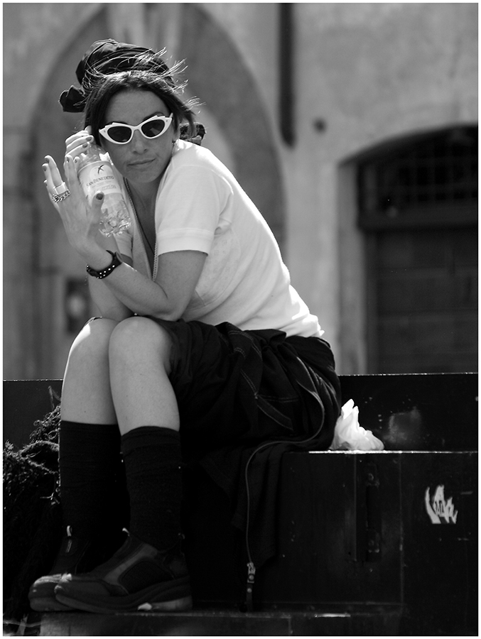 Donna con bottiglia. Sembra accorgersi dello scatto ed incredibilmente "reclamizzare" la sua acqua... Il b/n è ottenuto col metodo Brown.