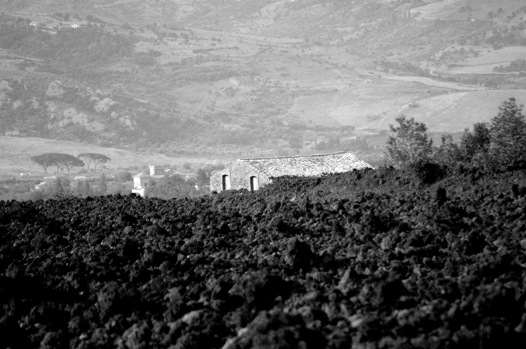 Non è terra arata,èsciara....cioè lava raffreddata che qlche anno fà dopo l'eruzione dell'etna ha investito ogni cosa! La casetta appunto è stata 'ingoiata' per la qsi totalità. Ciao