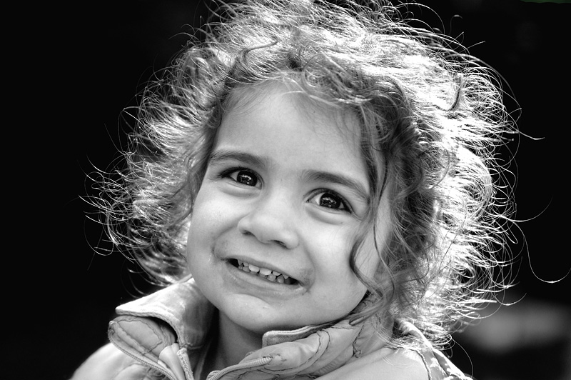 Il BN mi piace, nel mio monitor vedo però delle bruciature illeggibili tra i capelli. Belli gli occhi neri luccicanti, il viso chiaro e lo sfondo profondo.