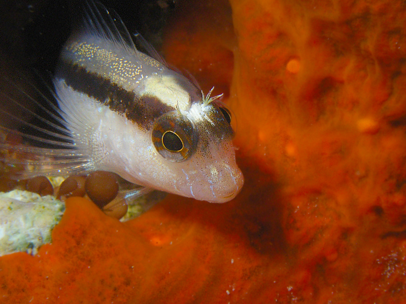 Ghiozzetto che fa capolino dalla tana rivestita di spugna rossa.