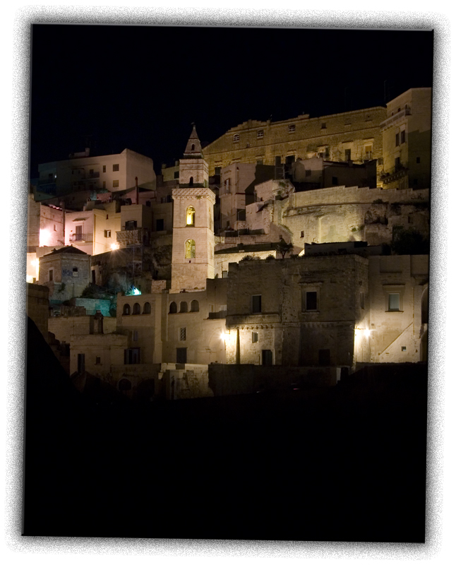 Matera è sempre bellissima e basta solo lei per rendere già bella una foto.Secondo me potevi evitare ogni ritocco con PS o almeno quelli del tipo cornice con effetto e cose simili. Non so se è un effetto voluto, ma la foto storta nella cornice oltretutto non è un bell'effetto.
