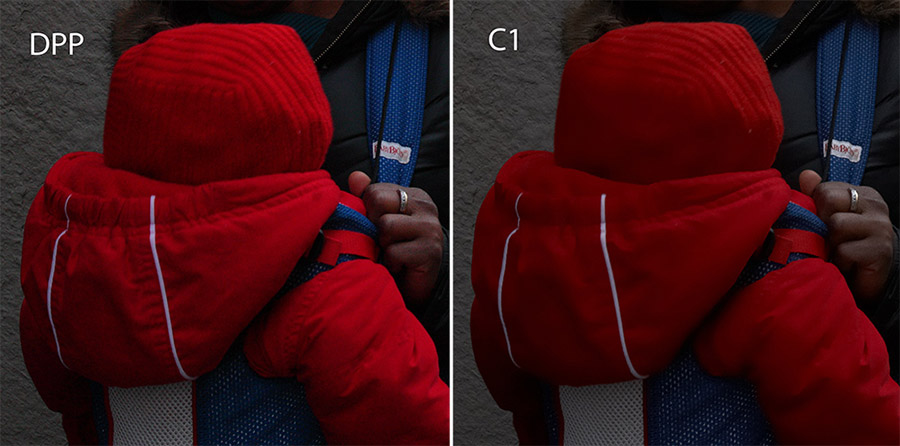 Un curioso incidente di percorso che ho avuto con C1 l'ho riscontrato sul dettaglio rosso vivo di un’immagine (che allego: “cappuccetto rosso”), per altro non problematica con gli altri cinque convertitori. Il problema è dovuto all'azione di riduzione del rumore di crominanza che in questo caso è stata stranamente distruttiva sui dettagli, pur essendo impostata al valore di default.