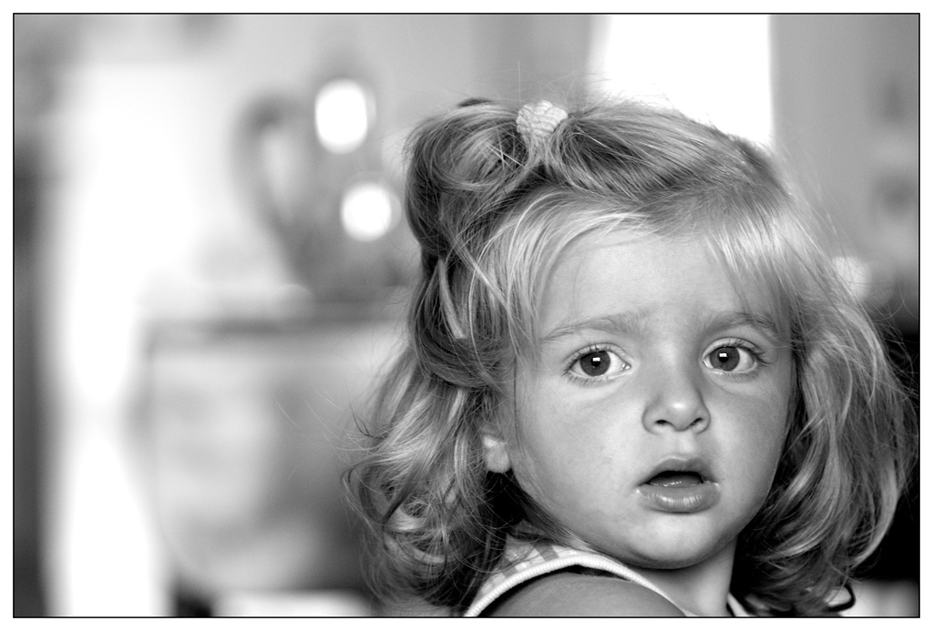 Molto bella l'espressione "stupita" della bimba. Mi piace molto anche la profondità di campo. Potendo le avrei lasciato due dita più di collo.  |
