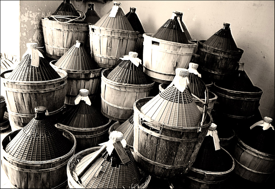 una cantina ben fornita! mi è piaciuta quella catasta di damigiane e l'idea di tentare più che un bianco-nero un tono sepia mi è sembrata una soluzione...